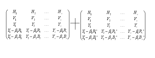 而現(xiàn)在的偽立體電視是由行向量H,幀向量V,亮度向量Y組成的三維線性空間。表達彩色信息的是由紅向量R,R',綠向量G,G',蘭向量B,B'組成的。共有H,V,Y,R,G,B,R',G',B'九個向量,通過不同的線性組合,組成的三維線性空間??捎靡韵伦笥叶€的矩陣來表示: