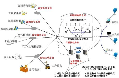 Google的街景系統(tǒng),中國(guó)水利部的防汛抗旱傳感器網(wǎng)絡(luò),醫(yī)院的遠(yuǎn)程手術(shù)讓我們聯(lián)想到生物的視覺(jué),軀體感覺(jué)和運(yùn)動(dòng)神經(jīng)系統(tǒng)。到2008年我們發(fā)表論文,繪制出這樣一張互聯(lián)網(wǎng)虛擬大腦結(jié)構(gòu)圖。