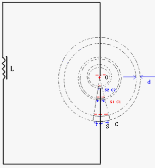 如圖3,在一個由“點(diǎn)電極”O(jiān)與“球冠電極”S組成的“球錐空間”中,如果O與S之間產(chǎn)生了足夠的“特高電壓”,那么這個“球錐空間”就可以被“雙向激擊”,依次連續(xù)發(fā)生“球冠振蕩”……、S2、……、S1、……、S,產(chǎn)生不同頻率的“電磁波”,并且呈“嵌套球狀”分布,由外到里即由球冠S到點(diǎn)O,產(chǎn)生的“電磁波”的頻率越來越大。由外向里,由球面向球心,產(chǎn)生的電磁波的頻率可以從“可見波”頻率,逐漸增大,有的可以達(dá)到紫外線頻率、X射線頻率,甚至出現(xiàn)伽馬射線頻率。[3][4]