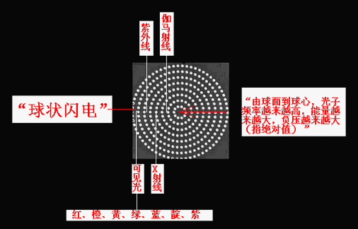 “棒電極”在球心對“球冠電極”“超短時間內(nèi)的高能”充電、放電,可以產(chǎn)生“球狀閃電”,其機(jī)理為:“雙向激擊”、“球冠振蕩”。因為“球冠振蕩”的頻率的不同,“球狀閃電”內(nèi)部呈現(xiàn)“嵌套球狀”,由外向里頻率由小到大,在可見光波段由外向里顯現(xiàn)為紅、橙、黃、綠、藍(lán)、靛、紫,而由外向里看,因疊加合成呈現(xiàn)白色,但是,當(dāng)最外面的頻率較小時,也可能是黃色或綠色或藍(lán)色的;一個大“光球”,可以分離為兩個或幾個小“光球”,但其顏色將會“變深”。[3][4]