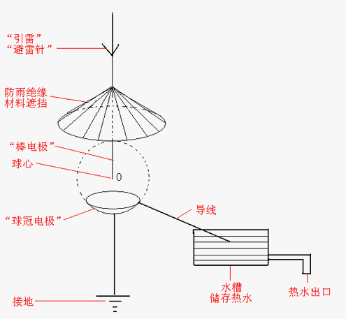 如圖7,可以在“雷擊村”,或其他發(fā)生“閃電”較多的區(qū)域,并且遠(yuǎn)離居民區(qū)的地方,放置一些大大小小的“棒電極——球冠電極”?!鞍綦姌O”樹立于空中,用于招引閃電,類似于“避雷針”,但必須與其接地的支撐物絕緣,并且深入到“球冠電極”球心的頂端部位,越細(xì)越好——越細(xì)激發(fā)的“球狀閃電”的能量越大?!扒蚬陔姌O”的頂端接地,在其邊沿接一導(dǎo)線引入水槽,在閃電放電時,產(chǎn)生的“球狀閃電”可以沿導(dǎo)線進(jìn)入水槽,“球狀閃電”所含的部分能量——熱能可以加熱水,這樣“閃電”的能量,就可以通過“接轉(zhuǎn)”為“球狀閃電”,再把可以“暫時儲存能量”的“球狀閃電”的部分能量——熱能傳給水,人們就可以利用熱水用于工業(yè)生產(chǎn)或日常生活了。
